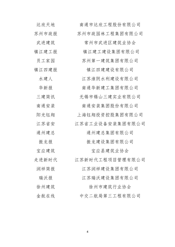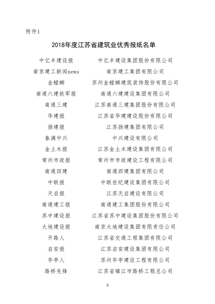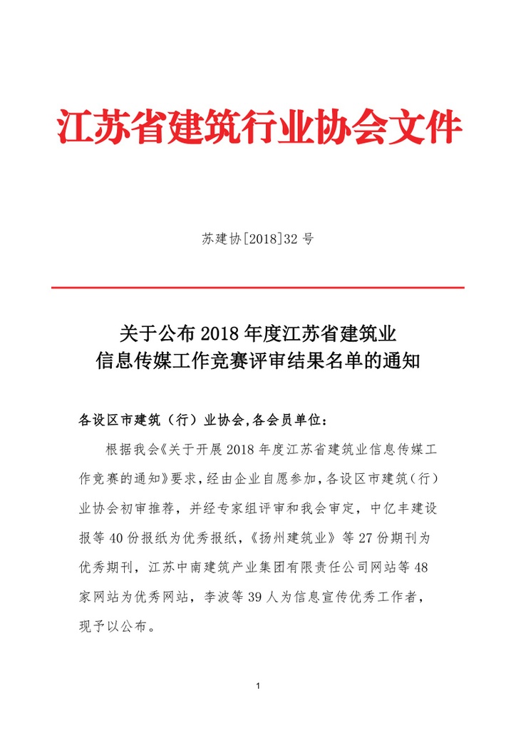 2018年8月,江蘇省建築業(ye) 協會(hui) 發布《關(guan) 於(yu) 公布2018年度江蘇省建築業(ye) 信息傳(chuan) 媒工作競賽評審結果名單的通知》,由公司主辦的《江蘇省安》報被評為(wei) 江蘇省建築業(ye) 優(you) 秀報紙,而公司網站繼被中國安裝協會(hui) 評選為(wei) 優(you) 秀網站後再度被江蘇省建築業(ye) 協會(hui) 評為(wei) 優(you) 秀網站!