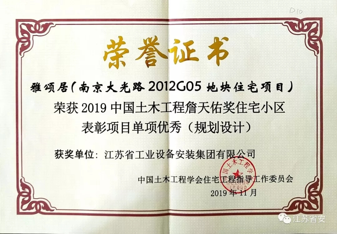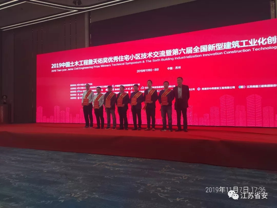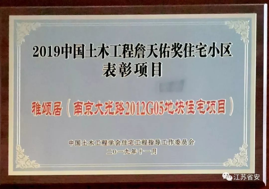 11月7日,在蘇州舉(ju) 行的2019中國土木工程詹天佑獎優(you) 秀住宅小區技術交流會(hui) 上,揭曉了“2019中國土木工程詹天佑獎優(you) 秀住宅小區金獎”獲獎名單,江蘇省安承建的南京大光路2012G05地塊住宅項目綜合機電工程位列其中,成為(wei) 江蘇省安首次獲獎的項目。