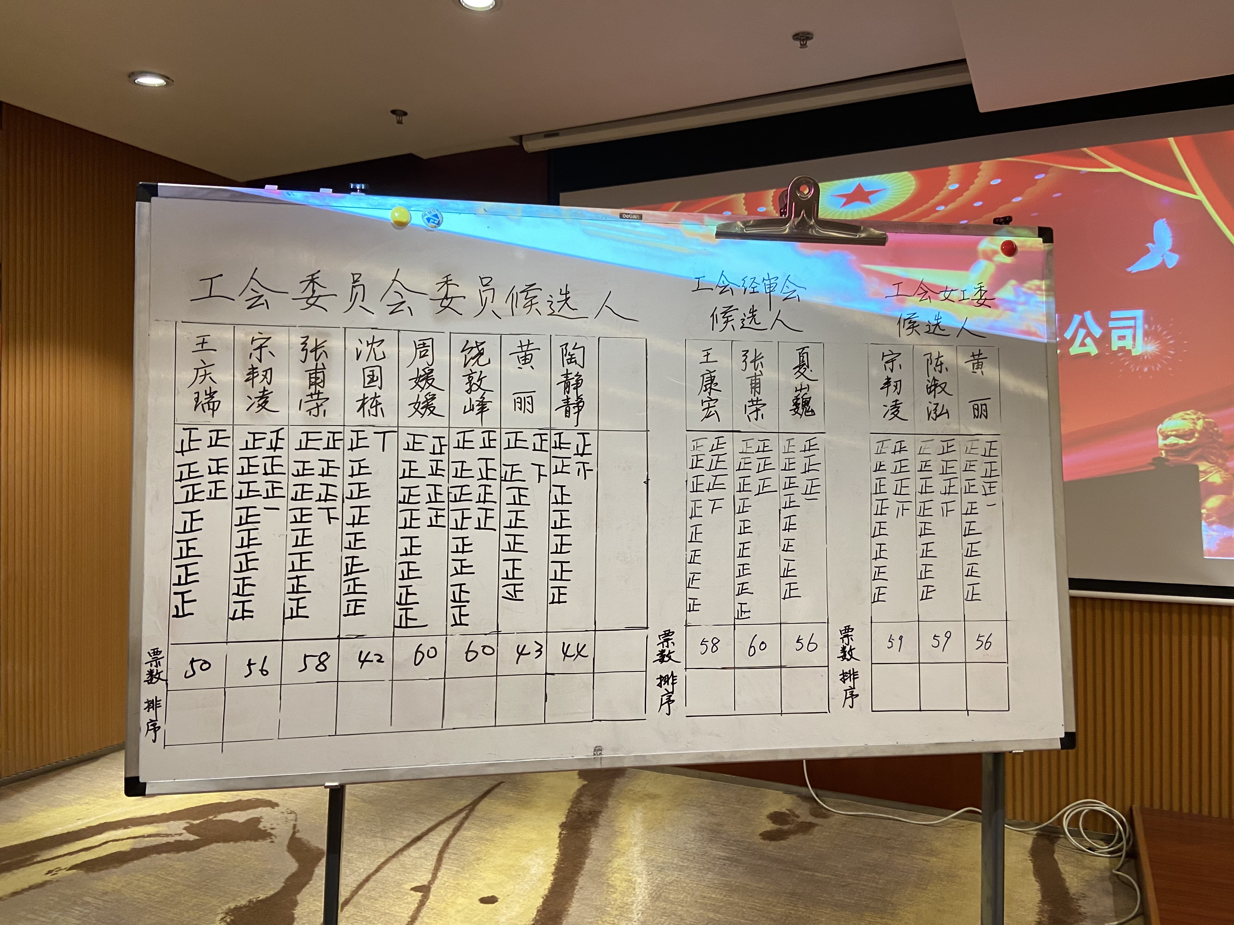 在第二會(hui) 場,由公司黨(dang) 委副書(shu) 記趙成顯同誌主持召開了“三委會(hui) ”的選舉(ju) 會(hui) 議。會(hui) 議以無計名投票的方式選舉(ju) 饒敦峰同誌當選工會(hui) 主席,周媛媛同誌當選工會(hui) 副主席,張甫榮同誌當選經費審查委員會(hui) 主任,宋韌淩同誌當選女工委員會(hui) 主任。