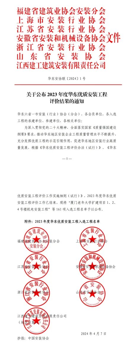 為(wei) 深入貫徹黨(dang) 的二十大精神,全麵落實國家《質量強國建設綱要》要求,我司努力推進優(you) 質工程建設,積極響應推動安裝行業(ye) 高質量發展的號召,以行業(ye) 的規範標準為(wei) 標準,積極參與(yu) 各項評優(you) 評先活動,在行業(ye) 最近公布的“2023年度華東(dong) 優(you) 質安裝工程”評選活動中,我司兩(liang) 項工程榜上有名。