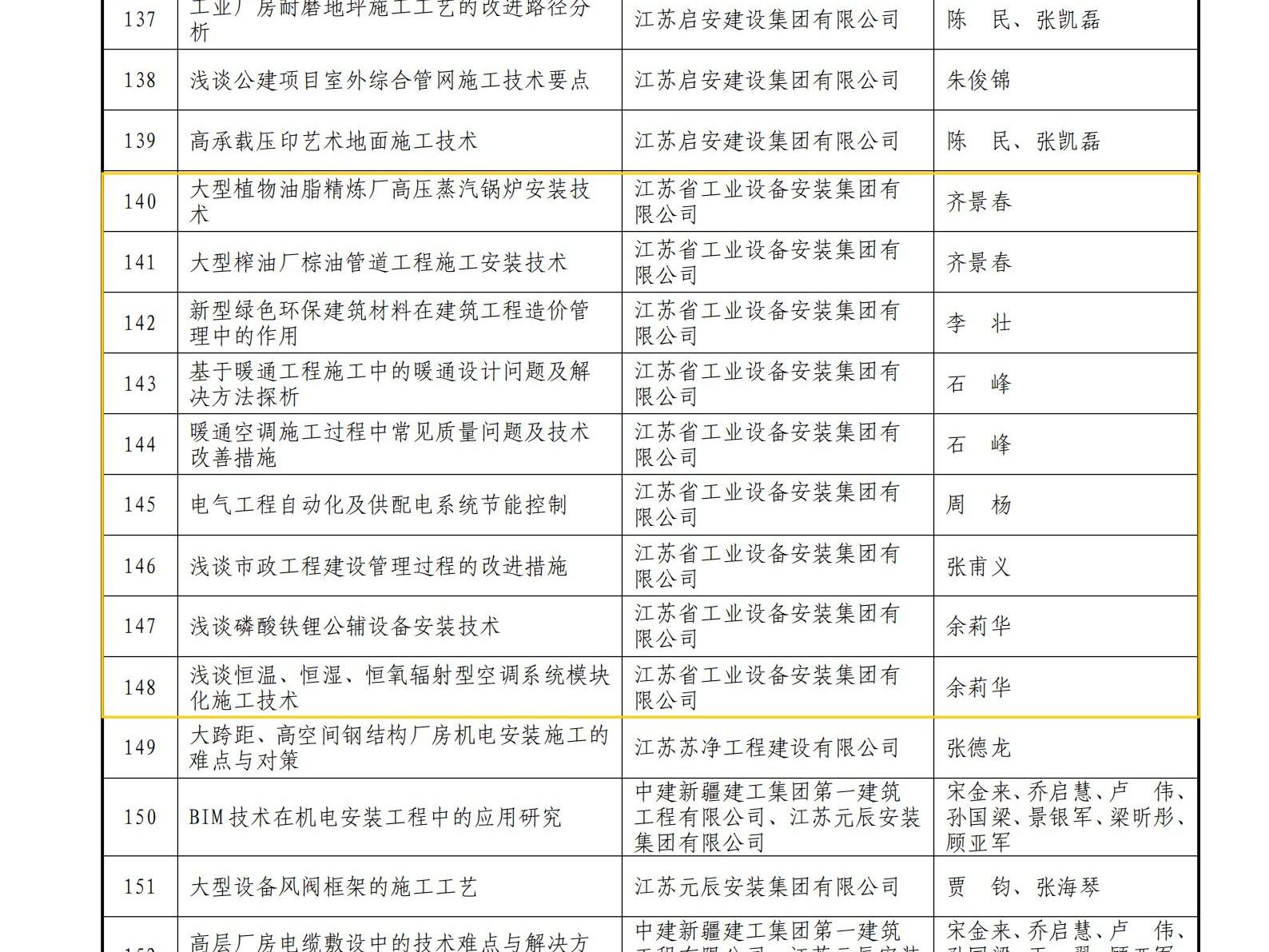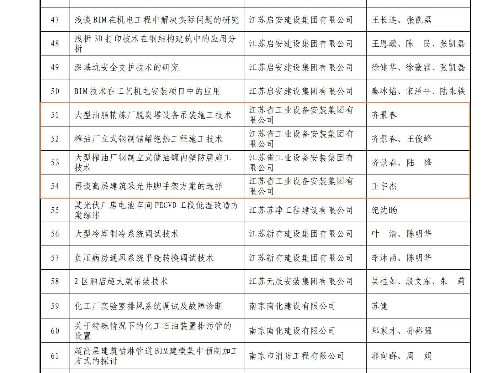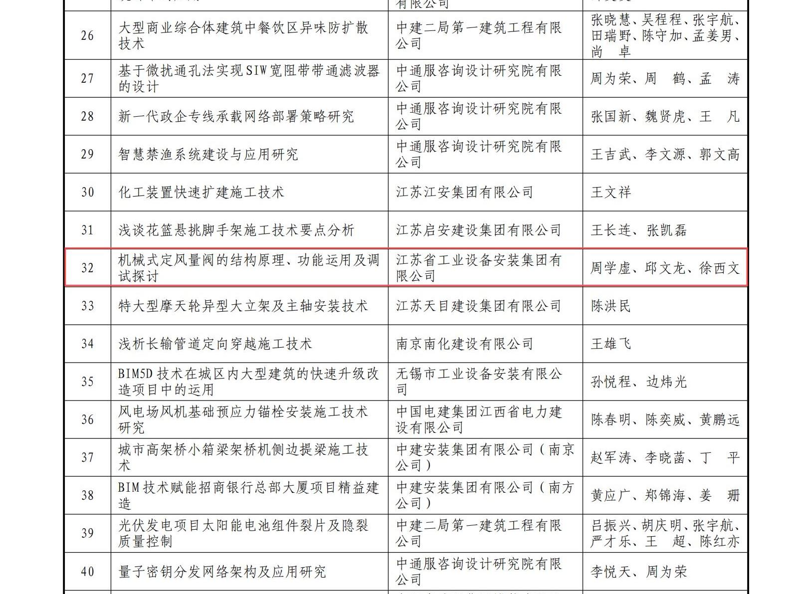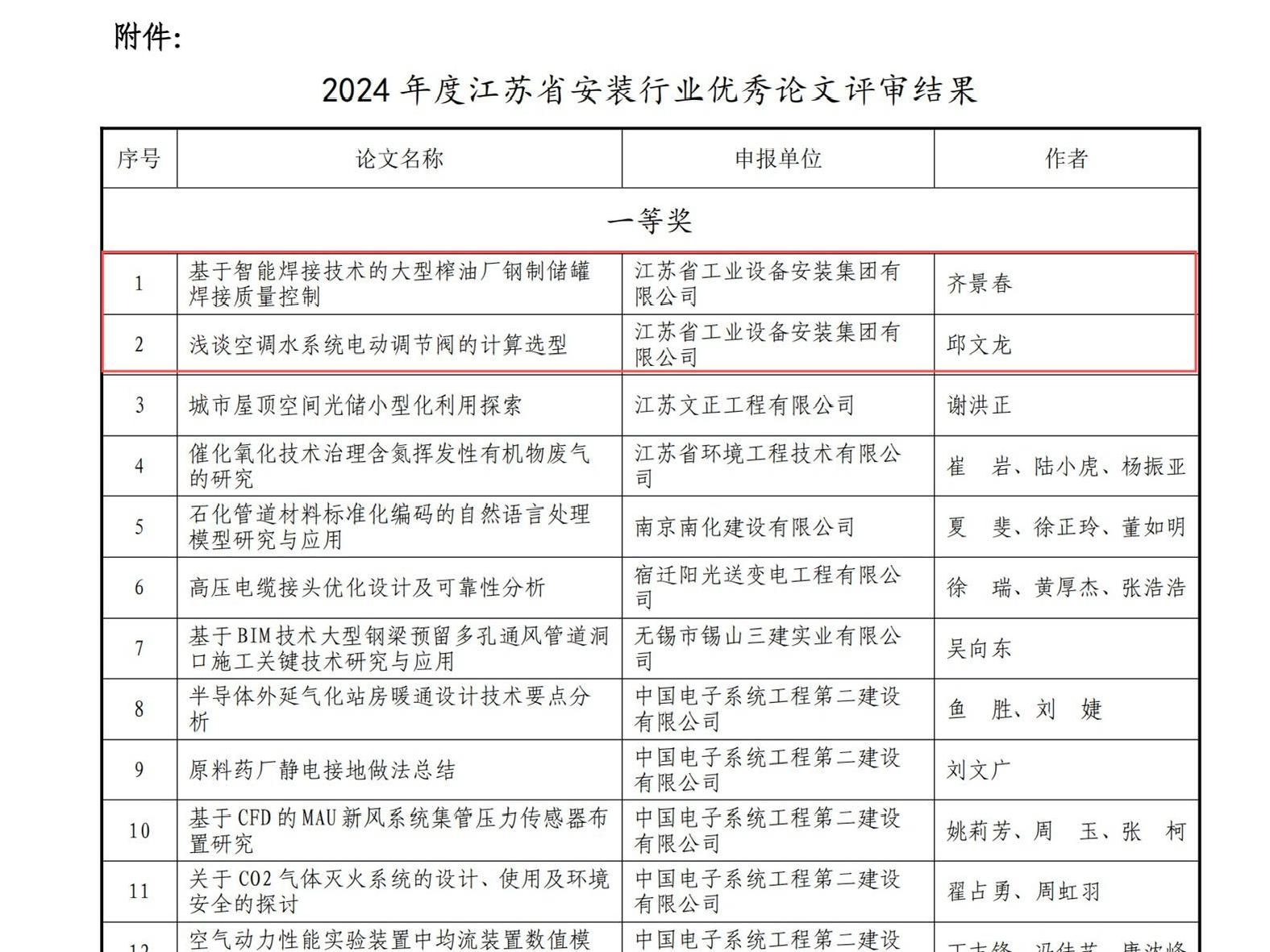 近日,江蘇省安裝行業(ye) 協會(hui) 頒布了“關(guan) 於(yu) 公布2024年度江蘇省安裝行業(ye) 優(you) 秀論文評選結果的通知”,我司共申報16篇論文全部獲獎,包括三篇獲評價(jia) 一等獎、四篇獲評二等獎,其餘(yu) 為(wei) 三等獎。